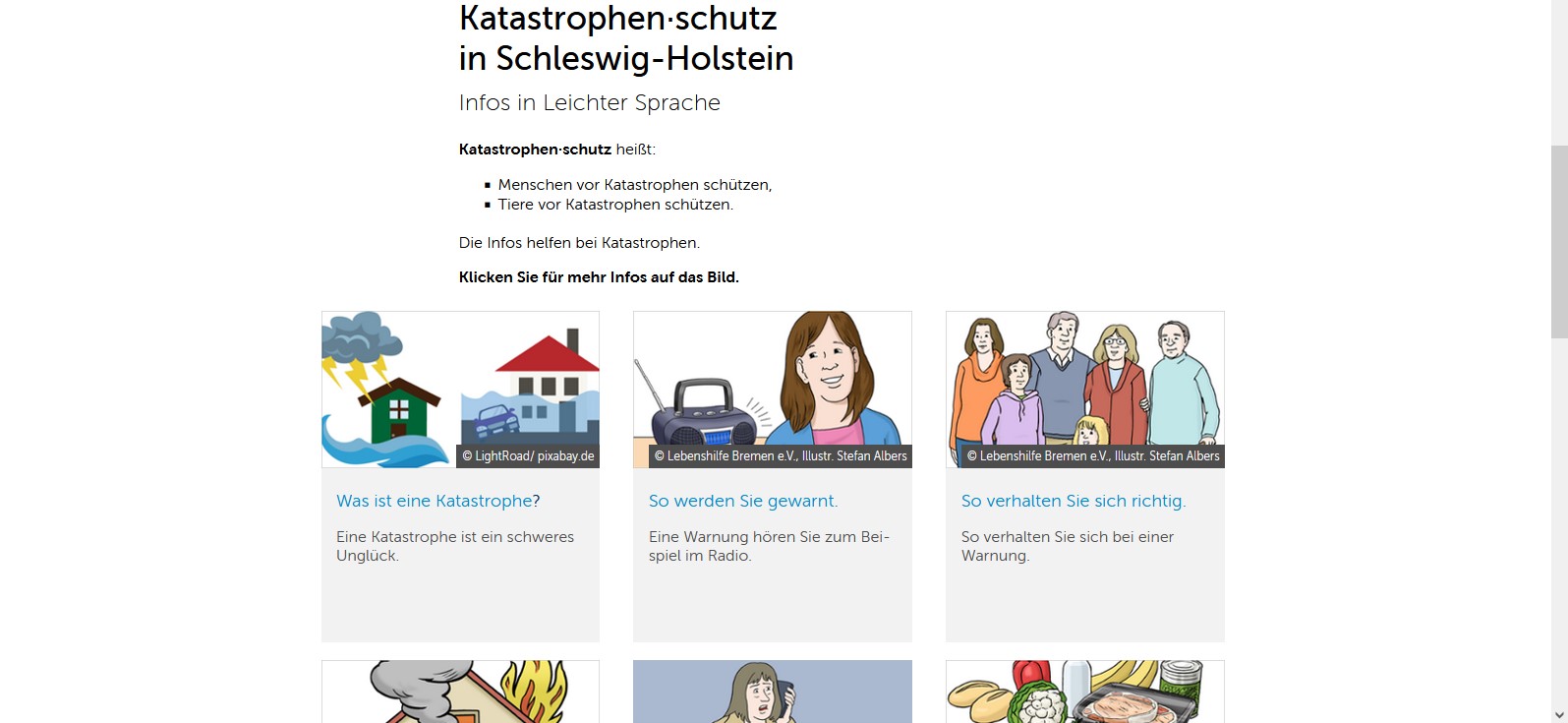 Das Innenministerium Schleswig-Holstein hat eine Website und eine Broschüre über den Katastrophenschutz in leichter Sprache herausgebracht. Davon profitieren vor allem Menschen mit geistiger Behinderung, Demenzkranke, Hörgeschädigte und Menschen mit geringer Lesekompetenz.