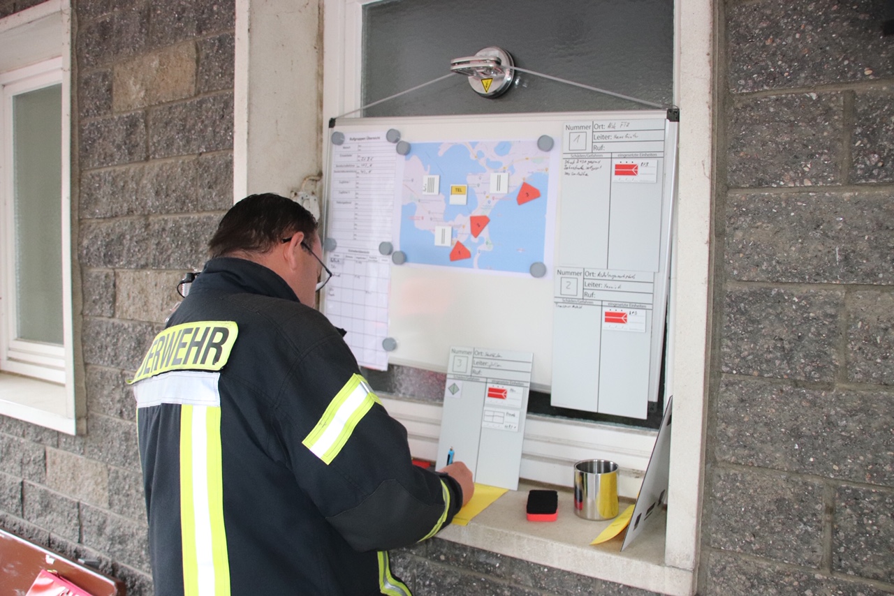 Der Stellv. Bereitschaftsführer Stefan Kantel hat sich eine passende Lage ausgedacht, um das Führen von drei unterstellten Einsatzabschnitten, die der Bereitschaft zugeordnet worden sind, zu üben.