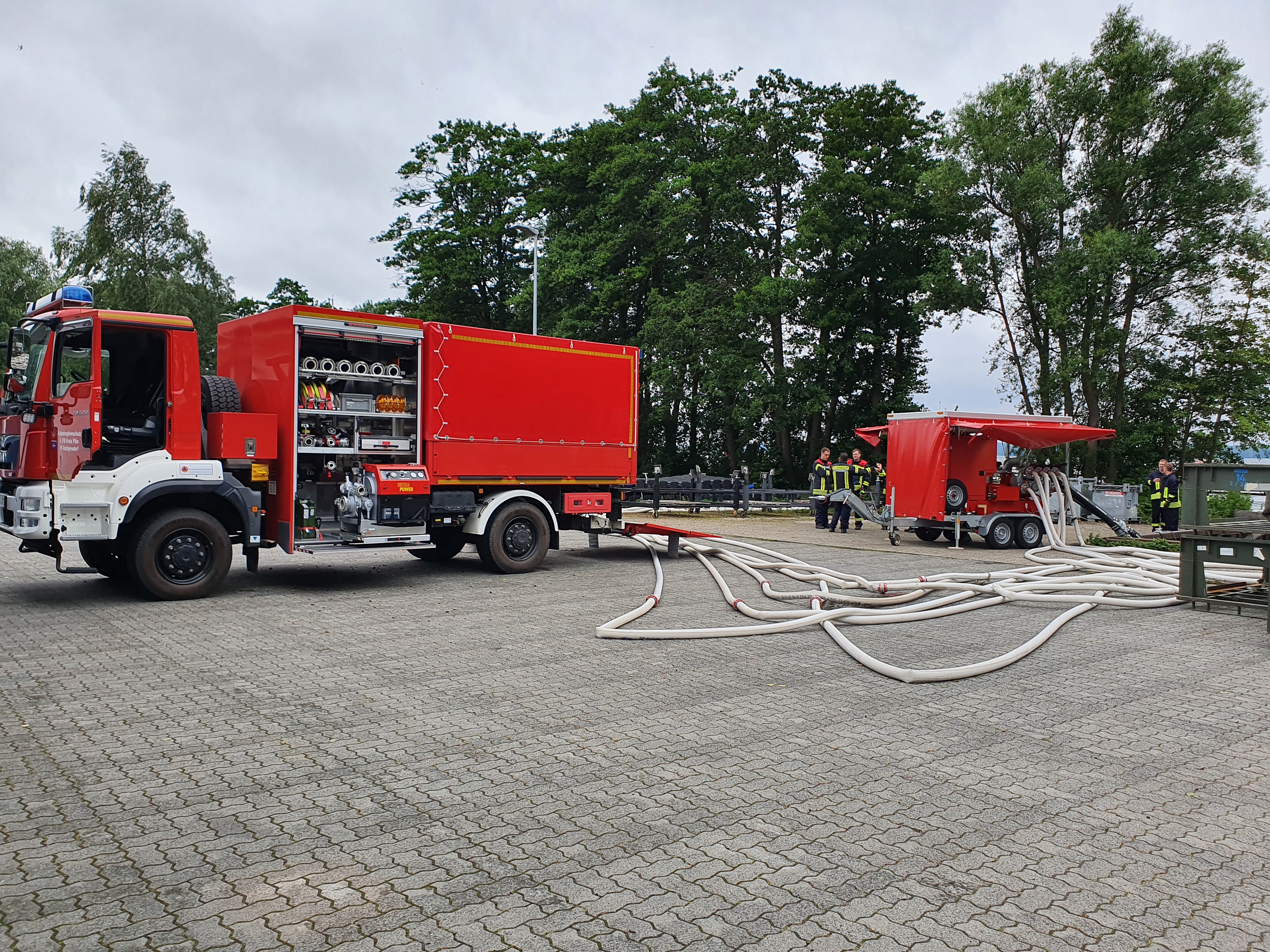 Am 4. Juli 2020 haben sich 11 Kameraden aus den Wehren Plön mit dem LF KatS, Rathjensdorf mit dem Schlauchwagen und der Hochleistungspumpe, der Zugführer und die Bereitschaftsführung in der Marineunteroffizierschule Plön getroffen, um gemeinsam mit der Hochleistungspumpe zu üben. In einem Katastrophenfall werden diese Komponenten auch zusammenarbeiten. Der Schlauchwagen wird die Hochleistungspumpe an der benötigten Stelle abstellen. Die Gruppe aus dem LF KatS wird die Hochleistungspumpe bedienen, während der Schlauchwagen seine 2.000 Meter Schlauch verlegen wird.
